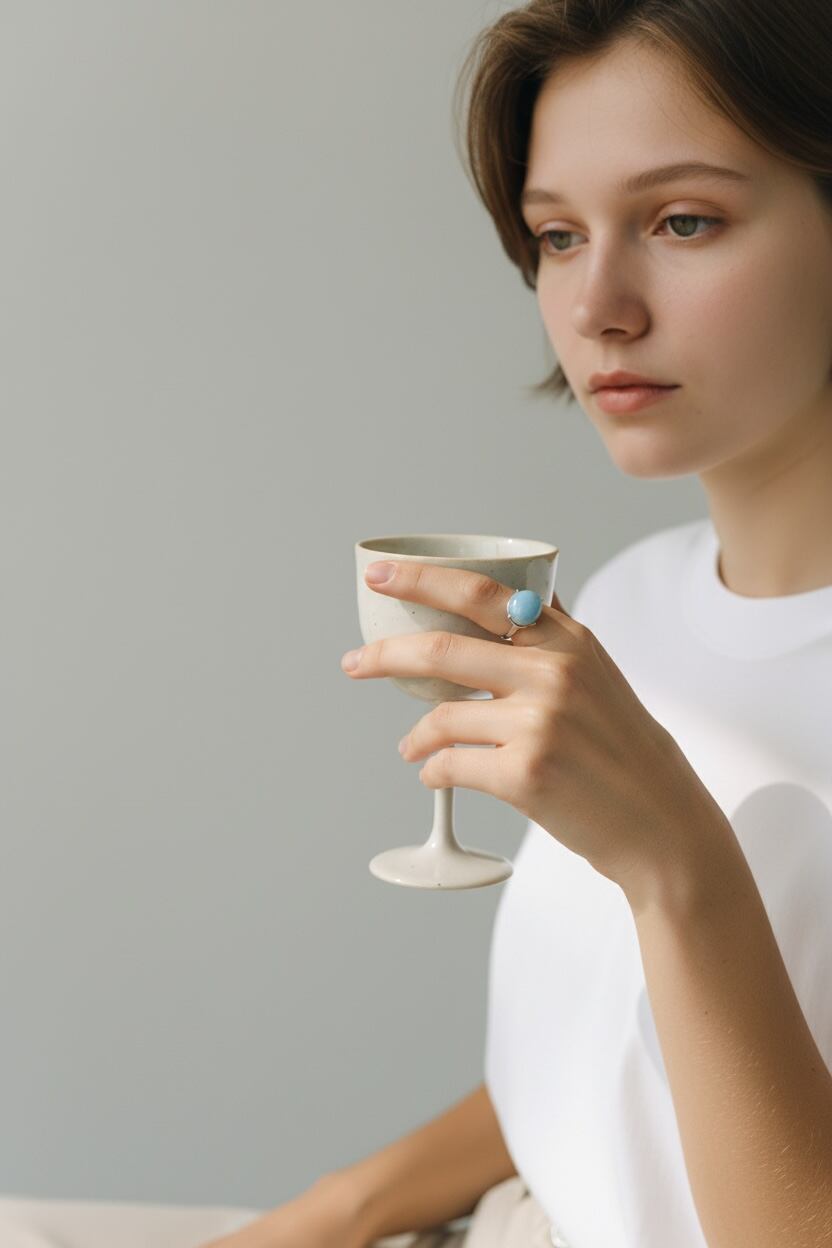 柔らかなブルーの天然石が肌になじみ、日常の装いからお出かけシーンまで幅広く活躍。特に白やベージュなど淡いトーンのトップスと合わせると、色の美しさが一層引き立ちます。