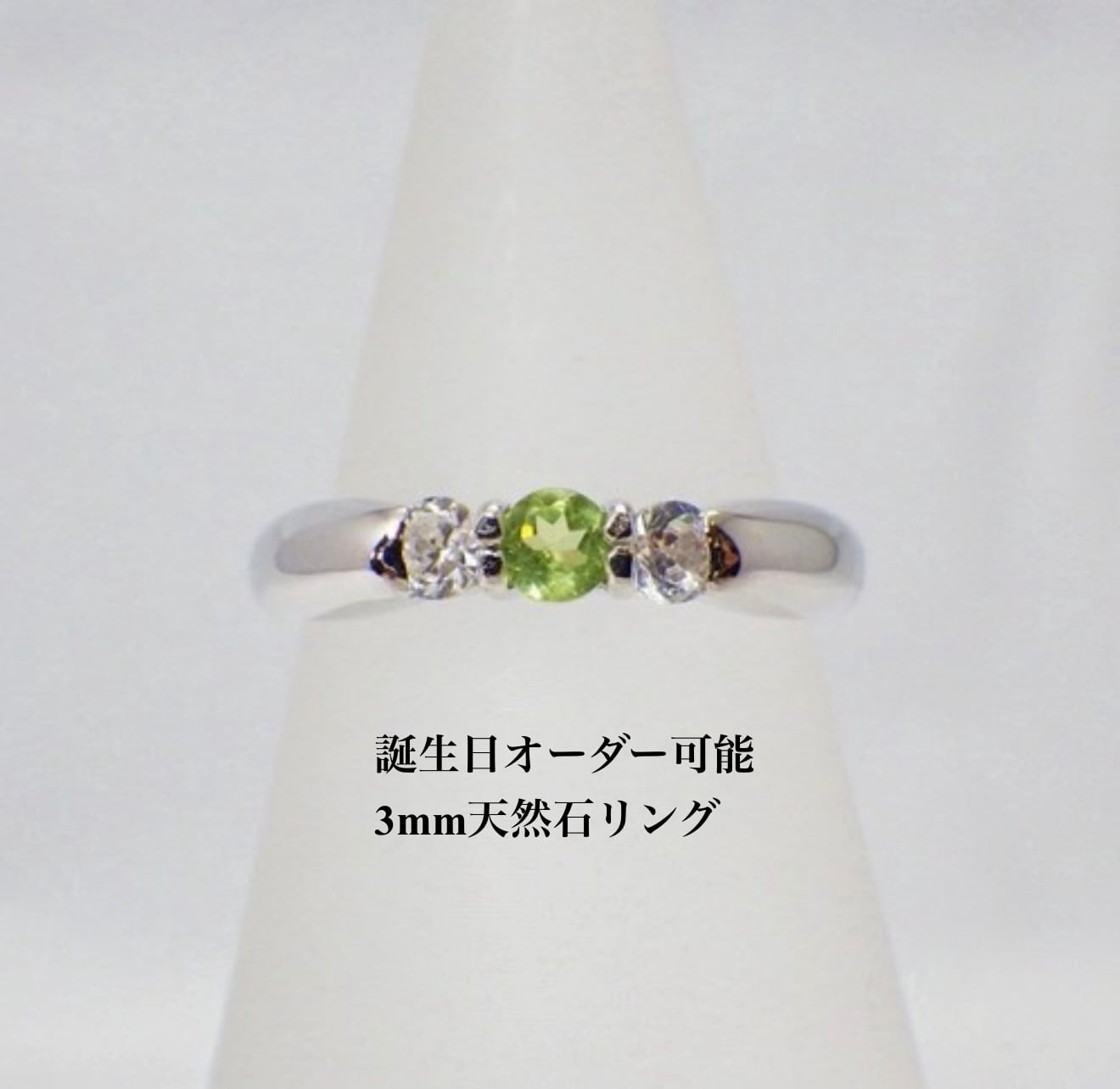 みずみずしいグリーンが美しいペリドットを中心に、両脇にきらりと輝くダイヤモンドを添えた、上品な3石デザインの天然石リング。作品ページの仕様では、中央に3mmの天然ペリドット、サイドに2.75mmの天然ダイヤモンドを2石使用し、素材はシルバー925・プラチナコーティング。変色しにくく、毎日身につけやすい一本です。